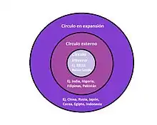 El círculo en expansión engloba a los países donde el inglés no juega un papel histórico ni gubernamental, pero está muy extendido como lengua extranjera o lengua franca. Esto incluye la mayoría de los restantes países del mundo: China, Rusia, Japón, Corea, Egipto, Indonesia y la mayoría de los países europeos.El número total de hablantes en este círculo es difícil de calcular ya que es empleado para fines específicos y limitados, normalmente Business English. Se estima un número de hablantes entre 100 millones y un billón.