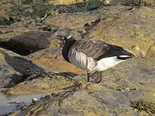 La barnacla carinegra, barnacla de cara negra, barnacla cara negra o ganso de collar (Branta bernicla)[2] es una especie de ave anseriforme de la familia Anatidae propia del Holártico. Es un ganso que cría en territorios del Ártico, en Noruega, Rusia, Canadá, Alaska y Groenlandia, y migra para pasar el invierno en el sur, en las costas de Europa occidental, la costa atlántica de Estados Unidos, la costa pacífica de América del Norte y la costa del nordeste de Asia y Japón.