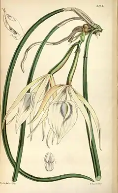 Es una orquídea de tamaño mediano, que prefiere el clima cálido y creciendo epifita con pedúnculos colgantes cortos llevando una sola hoja cilíndrica, carnosa verde oscuro, aguda, con trazas de color rojo. Florece en una inflorescencia que surge de un pseudobulbo maduro que lleva de una a 5 flores, nocturnas, fragantes y cerosas que se producen en la primavera hasta después de principios de verano.[1]