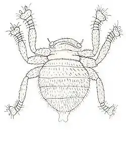 - Adulto: El adulto tiene ojos rudimentarios sobre las antenas que aparecen como puntos pálidos en la superficie de la cutícula rodeados por anillos quitinosos pigmentados más oscuros. No hay rastro de alas o de balancines. El tarso tiene cinco segmentos; cada segmento terminal contiene una estructura tipo peine, dividida en el centro, con un número variable de dientes. Los peines permiten que Braula se aferre firmemente al anfitrión.