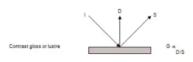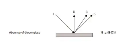 En 1937, Hunter,[3] como parte de su artículo de investigación sobre el brillo, describió seis criterios visuales diferentes atribuidos al brillo aparente. Los siguientes diagramas muestran las relaciones entre un haz de luz incidente, I, un haz reflejado especularmente, S, un haz reflejado difusamente, D y un haz reflejado casi especularmente, B.