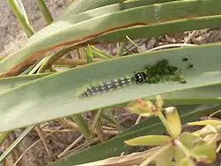 ![]() Orugas de B. crini alimentándose dentro de las hojas del lirio de mar (Pancratium maritimum). Playa del Serradal. Castellón | ||