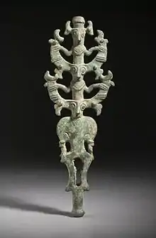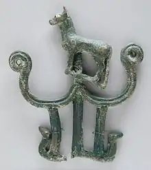Tomando los grupos en lo que actualmente se considera que es su amplia secuencia cronológica, los primeros son los "remates de animales", con dos animales enfrentados rampantes, generalmente un ar de íbices cornilargos (o cabras o muflones) o felinos, uno frente al otro con un tubo central o anillos abiertos (formados en las uniones de sus atas delanteras y traseras) entre ellos. La cabra bezoar (capra aegagrus aegagrusis), la especie salvaje local de cabra o íbice, ya estaba domesticada miles de años antes;[26] tiene unos largos cuernos curvados con costillas nudosas. En comparación con los tipos posteriores, los animales son más naturalísticos, especialmente el grupo de íbices, aunque no tanto que se pueda identificar con seguridad la especie a la que pertenecían.[27] En algunos ejemplos las figuras son "demonios", con rasgos humanos excepto por sus largos cuernos.[28]