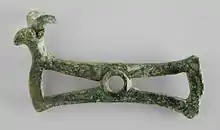 Otra clase habitual de bronces son parejas de carrilleras de bocados; cuando están enteros vienen con una barra entre ellas que va a la boca del caballo. Hay a menudo anillos en las artes superior o trasera de las placas, para asegurar que se aten las riendas alrededor de la cabeza del caballo. Son placas planas caladas, con un agujero central reforzado para que los atraviesen los bocados; hay conjuntos completos y en ellos están sujetados en su sitio por los finales de la barra del bocado curvada hacia atrás.[33]