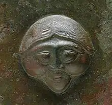 Las caras están en su mayor parte redondeadas para llenar un espacio circular, y muchas pretenden ser femeninas. Carecen de barbas, y algunas figuras enteras son claramente femeninas, sentadas con las piernas abiertas mostrando una vulva, quizá mostrada dando a luz; en otros alfileres esto está claro. Estas piezas eran, presumiblemente, exvotos para la fertilidad. Los ojos a veces están incrustados en blanco, con un punto negro representando la pupila. La cabeza puede ocupar la mayor parte del disco, o ser pequeña, en el centro de un ancho borde con otros temas. Otros diseños presentan un amplio abanico de temas, con algunos motivos puramente decorativos, y otros presentan algunas escenas complejas, principalmente religiosas, con muchas figuras ("demonios de apariencia extraña y animales aparentemente involucrados en actividades de un culto y mitológicas", como las describe Muscarella).[39]