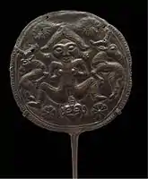 - Alfiler de disco con una mujer dando a luz, flanqueada por antílopes