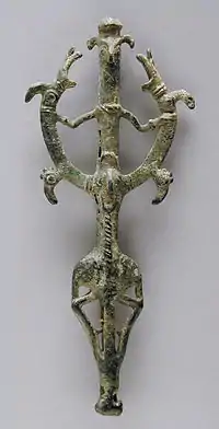 Grandes cabezas de alfileres decoradas son el tercer tipo más común y distintivo de los bronces de Luristán, diferenciándose en dos grupos distintivos: esculturales y calados, usando muchos el repertorio iconográfico de otros tipos de objetos y cabezas de disco planas, normalmente redondeadas. Su uso no se sabe con seguridad; probablemente se usaron tanto como exvotos, tal como sugiere la cantidad encontrada en el templo excavado en Surkh Dum, pero también usados como decoración o para sujetar las ropas. Se han sugerido otros usos.[36] No se han encontrado en tumbas excavadas.[37] También se han encontrado en Surkh Dum cabezas de alfiler en hueso y mayólica.