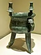 - Jiǎ (斝): una caldera para calentar el vino. Como un dǐng (鼎) excepto que el cuerpo es más alto que ancho, y puede tener dos palos (柱) pegados hacia arriba desde el borde, actuando como asas.