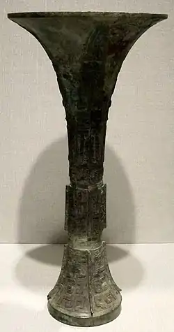 Los conjuntos de bronces rituales chinos son los objetos supervivientes más impresionantes de la Edad del Bronce china. Durante la dinastía Shang, China se convirtió en una de las civilizaciones más hábiles en el trabajo de bronce del mundo antiguo, ya que el pueblo fundía metal para hacer utensilios de cocina, herramientas, armas y otros artículos para el hogar. Los arqueólogos modernos ven tal preservación de cómo vivían los antiguos chinos interpretando las pinturas de laca sobre madera que ayudaron a preservar antiguos artefactos de bronce chinos.[1] Datados de alrededor de 1650 a. C., estos vasos elaborados con decoraciones fueron depositados como bienes funerarios en las tumbas de la realeza y la nobleza, y evidentemente fueron producidos en gran número, hay excavaciones documentadas en las que se encontraron más de 200 piezas en una sola tumba real. Fueron producidos para que un individuo los usara en ofrendas rituales de comida y bebida a sus antepasados en templos familiares o salones ceremoniales sobre tumbas, o más bien en banquetes rituales en los que participaban miembros de una familia; los primeros registros literarios hablan de estos. A la muerte del propietario, serían colocados en su tumba, para que pudiera seguir presentando sus respetos en el más allá; otros ejemplos fueron emitidos específicamente como bienes funerarios.[2]
