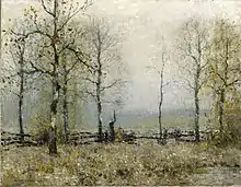 Robert Bruce Crane (1857) – 30 de octubre de 1937) fue un pintor estadounidense. Se unió a la Colonia artística de Old Lyme a principios del siglo XX. Sin embargo, su período más activo se produjo después de 1920, cuando durante más de una década realizó bocetos al óleo de bosques, prados y colinas. Se convirtió en un pintor tonalista bajo la influencia de Jean-Charles Cazin en Grez-sur-Loing. Las obras de madurez de Crane eran casi siempre escenas de otoño e invierno. Por lo general, pintaba en su estudio en Bronxville, Nueva York, donde, como muchos de los tonalistas, se basaba principalmente en los recuerdos de sus experiencias de dibujo al aire libre. Sus obras se pueden encontrar en el Museo Florence Griswold y en el Museo de Newark. Fue descendiente del congresista Stephen Crane. [1]