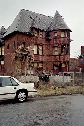 1874 | 79 Alfred Street | Segundo Imperio, neorrenacentista francés, italianizante | Desconocido | También conocida como Joseph Lothian Hudson House o Grace Whitney Evans House. Construida en 1874[73] para el armador Philo Wright, la casa fue un regalo de David Whitney Jr. a su hija Grace tras su matrimonio con John Evans en 1882.[52] Más tarde se convirtió en la residencia de la familia Joseph L. Hudson.[73] Incluido en el Registro Nacional de Lugares Históricos.[48] |