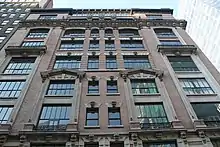 En el noveno piso hay un balcón y una balaustrada de metal sobre la cornisa. En la calle 40, las tramos más externas están flanqueadas por pilares de ladrillo continuos, al igual que en la sección media, y tienen ventanas que flanquean pequeñas entradas. Entre estos hay un conjunto de ventanas empotradas, con dos ventanas grandes que flanquean dos ventanas estrechas. Estas ventanas están separadas por amplias pilastras, sobre las cuales hay capiteles decorativos. En la Sexta Avenida, las ventanas del noveno piso son rectangulares y tienen volutas y dinteles abocinados sobre ellas. Hay un entrepiso sobre el noveno piso en la Sexta Avenida, que tiene aberturas sencillas. Dos de las ventanas centrales del noveno entrepiso se combinaron en una abertura de estilo moderno.[21]