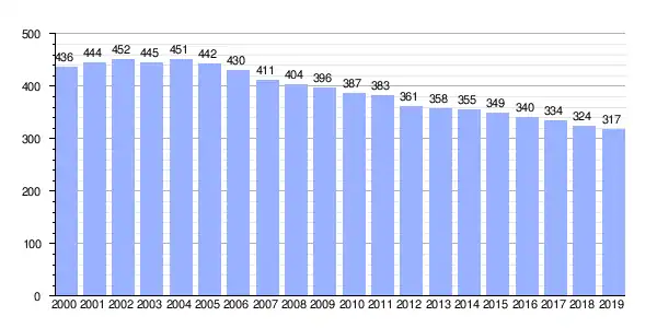 Gráfica de evolución demográfica de Budiño entre 2000 y 2019 |
