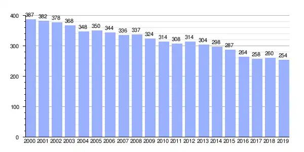 Gráfica de evolución demográfica de Buján entre 2000 y 2019 |