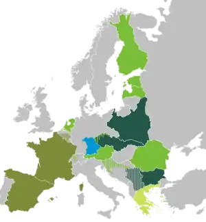 Miembros fundadores (adheridos en 1921) Adheridos en 1927 Adheridos en 1934 Partido Popular Bávaro (implicado en 1921) Partido Agrario griego (adherido en 1930, expulsado en 1931) Nota: Las zonas rayadas representan partidos regionales.