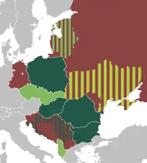Las iniciativas agrarias fueron saboteadas desde 1933 por la Alemania nazi, cuya dirección veía la totalidad de Europa central como lebensraum alemán.[70] El Bloque de Países Agrarios celebró su última conferencia en Bucarest en junio de 1933, tras lo que desapareció debido a la hostilidad de las grandes potencias y a la falta de compromiso entre los estadistas polacos.[71] Aunque Italia participó en la Conferencia del Trigo de 1931, lo que supuso un triunfo para los pequeños estados agrarios,[72] su gobierno fascista señaló a los internacionalistas campesinos como enemigos cruciales. En 1934, como parte del acercamiento italo-alemán, maniobró para que Hungría se retirase del Bloque de Países Agrarios.[73] En diciembre del año siguiente, un artículo del Corriere della Sera afirmaba que una conspiración continental, que implicaba a las Internacionales tanto roja como verde, estaba dispuesta a destruir Italia y, a través de ello, «el orden de Europa».[74]