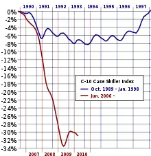 ![]() Comparación de la variación porcentual en el Índice de precios de viviendas Case-Shiller para las correcciones de vivienda en los períodos que comienzan en 2005 (rojo) y en los años 80 a 1990 (azul), comparando los valores mensuales de CSI con los valores máximos inmediatamente antes del primer mes de Disminuir todo el camino a través de la recesión y la recuperación total de los precios de la vivienda. | |