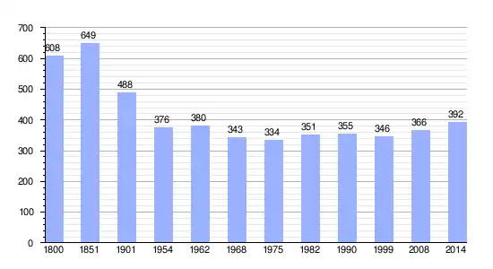 Los datos demográficos contemplados en este gráfico de la comuna de Burcy[4] se han cogido de 1800 a 1999 de la página francesa EHESS/Cassini, y los demás datos de la página del INSEE.[5]