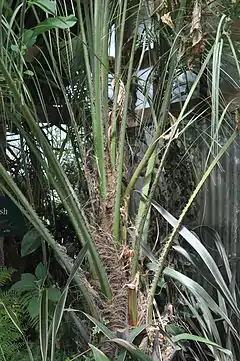 - Estípite solitario, largo, alcanza más de 6 m de altura; de color gris, y conserva mucho tiempo la base de los peciolos, que formaron a gruesas ramas.