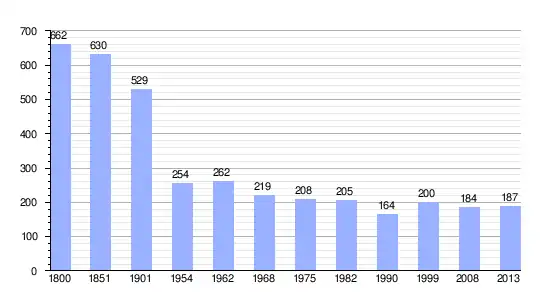 Los datos demográficos contemplados en este gráfico de la comuna de Buzeins[4] se han cogido de 1800 a 1999 de la página francesa EHESS/Cassini, y los demás datos de la página del INSEE.[5]