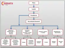 Los artículos 9 al 15 de la Ley 4/2014 de 1 de abril,[2] Básica de las Cámaras Oficiales de Comercio, Industria, Servicios y Navegación, la Ley 10/2001, de 11 de octubre, de Cámaras Oficiales de Comercio, Industria y Navegación de Andalucía, y su Reglamento de Régimen Interior regulan la organización de la Cámara de Comercio de Málaga. Ésta se estructura en los siguientes órganos y departamentos: