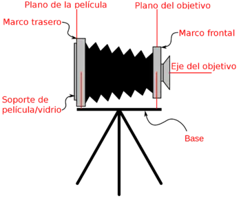 El fuelle es flexible, con un plegado tipo acordeón. Cubre el espacio entre el objetivo y la película, y se flexiona para acomodar los movimientos los marcos.[3] El marco frontal es una placa en el frente de la cámara que sostiene el objetivo y, normalmente, un obturador.