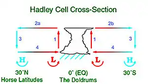 Las células de Hadley se extienden desde el Ecuador hasta latitudes de unos 30° en ambos hemisferios. Este calor es transportado en un movimiento celular con el aire ascendiendo por convección en las regiones ecuatoriales y desplazándose hacia las latitudes superiores por las capas altas de la atmósfera. El ascenso del aire caliente en el ecuador está acompañado de la formación frecuente de tormentas convectivas en la llamada zona de convergencia intertropical.