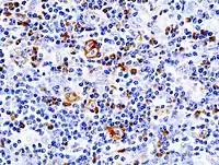 Células de Reed-Sternberg de una biopsia de ganglio linfático, tinción inmunohistoquímica (CD30). En el centro superior de la imagen observamos una célula gigante bilobulada con los núcleos en forma de ojos de búho.