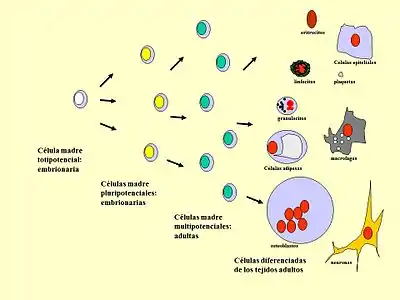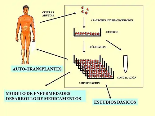 Las células madre pluripotentes inducidas (normalmente abreviadas como células iPS, por sus siglas en inglés: "induced Pluripotent Stem" ) son un tipo de células madre con características pluripotenciales (capaces de generar la mayoría de los tejidos) derivadas artificialmente de una célula que inicialmente no era pluripotencial.[1] Por lo general se utiliza como una célula adulta diferenciada (diferenciación celular) procedente de un tejido, sobre la que se induce la expresión de varios genes exógenos, tales como Oct4, Sox2, c-Myc y Klf4, capaces de des-diferenciarla.[2] Se denomina reprogramación a esta desdiferenciación. Las células iPS son capaces: a) de diferenciarse en células de tejidos pertenecientes a las tres capas germinales de un embrión natural (ver embriogénesis humana): endodermo, mesodermo y ectodermo, b) de formar teratomas, y c) ratones quiméricos o quimeras (quimerismo).[3][4][5]