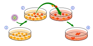 Las células iPS se derivan de células adultas por transferencia (transfección) de varios genes exógenos asociados a células ES. Generalmente para una transferencia eficiente se utilizan retrovirus que actúan como vehículos o vectores de los genes exógenos.[6] Los genes exógenos transferidos son principalmente los correspondientes a factores de transcripción (transcripción genética) asociados a las células ES.[7] Después de 3–4 semanas , un pequeño porcentaje de las células transferidas comienzan a diferenciarse volviéndose morfológica y bioquímicamente similares a las células ES. Las células iPS o células adultas reprogramadas se aíslan por selección con un gen de resistencia a antibióticos y por confirmación de su identidad (ver después).