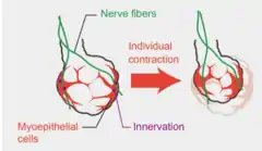 La función de estas células mioepiteliales es «ordeñar» la sección secretora, de modo que se contraen y producen acúmulo de esta porción secretora, lo cual provoca expulsión del producto de secreción.