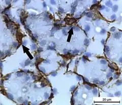 Muestran un citoplasma de aspecto estrellado, con numerosas prolongaciones que se interdigitan con otras similares de células mioepiteliales adyacentes.[5]