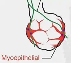 Las células mioepiteliales son un componente normal de los acinos y conductos de las glándulas exócrinas, donde se localizan entre las células epiteliales secretoras y la membrana basal. La función de estas células mioepiteliales es múltiple: asisten la progresión de la secreción mediante sus contracciones, sirven de barrera entre el tejido conjuntivo y el epitelio formando la membrana basal, tienen funciones de sostén y parácrinas de organización y polaridad.[1]