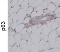 Las células mioepiteliales son la barrera entre las células epiteliales secretoras y el estroma circundante en el sistema de ductos de la glándula mamaria. Se han identificado y validado varios marcadores de inmunohistoquímica de la célula mioepitelial en tejido humano. Los patólogos los utilizan como herramientas de diagnóstico para distinguir el carcinoma in situ del cáncer de mama invasivo.[1]