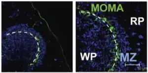 La zona marginal (ZM) del bazo, contiene múltiples subtipos de macrófagos y células dendríticas entrelazadas con los linfocitos B (MZ B en inglés). Esta zona marginal no se forma completamente en roedores hasta 2 a 3 semanas después del nacimiento y pasados de 1 a 2 años en humanos. [3]