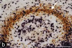 En los seres humanos, pero no en los roedores, las células de la zona marginal B también se encuentran en la pared interna del seno subcapsular de los ganglios linfáticos, el epitelio de las criptas amigdalinas y el área subepitelial de los tejidos linfoides asociados a la mucosa, incluido el domo subepitelial de placas intestinales de Peyer.[2]