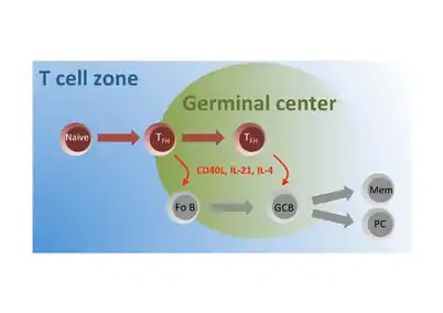 Las células T auxiliares foliculares B (también conocidas como células T auxiliares foliculares o TFH), son células T CD4+ experimentadas con antígeno que se encuentran en la periferia dentro de los folículos de células B de órganos linfoides secundarios, como ganglios linfáticos, bazos y placas de Peyer, y se identifican por su expresión constitutiva del receptor de folículo de células B CXCR5. Tras la interacción celular y la señalización cruzada con sus células B foliculares (Fo B) afines, las células TFH desencadenan la formación y el mantenimiento de los centros germinales a través de la expresión del ligando CD40 (CD40L) y la secreción de IL-21[1] e IL-4. Las células TFH también migran hacia estos centros germinales sembrados, compuestos predominantemente por células B que se dividen y mutan rápidamente. Dentro de los centros germinales, las células TFH desempeñan un papel fundamental en la mediación de la selección y la supervivencia de las células B que se diferencian en células plasmáticas especiales capaces de producir anticuerpos de alta afinidad contra antígenos extraños, o células B de memoria capaces de una rápida respuesta inmunológica en el futuro si alguna vez se vuelve a encontrar el mismo antígeno. También se cree que las células TFH facilitan la selección negativa de células B mutadas que pueden ser autoinmunes en el centro germinal. Sin embargo, los biomecanismos por los cuales las células TFH median la tolerancia del centro germinal aún no se han entendido completamente.