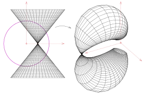 Las líneas que generan el cono se corresponden con círculos, que se intersecan en el origen y la imagen del vértice del cono. La imagen del cono es un cíclido de doble asta. La imagen muestra las imágenes de los segmentos de línea (del cono), que en realidad son segmentos de círculos.