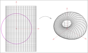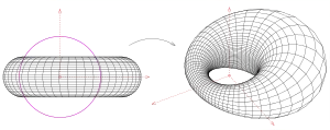 Ambos haces de círculos en el toro (que se muestran en la imagen) están aplicados en los correspondientes haces de círculos en el cíclido. En el caso de un toro con auto-intersección, se obtendría un cíclido de huso.