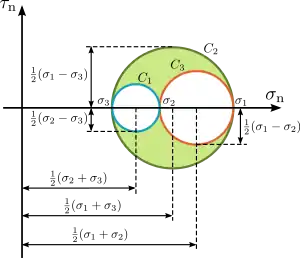 Usando ejes rectangulares, donde el eje horizontal representa la tensión normal y el eje vertical representa la tensión cortante o tangencial para cada uno de los planos anteriores. Los valores de la circunferencia quedan representados de la siguiente manera: