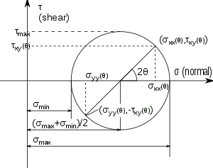 En dos dimensiones, la Circunferencia de Mohr permite determinar la compresión máxima y mínima, a partir de dos mediciones de la tensión normal y tangencial sobre dos ángulos que forman 45º:
