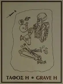 La tumba iota tenía dos esqueletos de hombre; uno de ellos con una espada de bronce con puño de marfil, un cuchillo de bronce con puño de cristal de roca y una lanza de bronce, además de varios objetos de cerámica.
