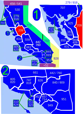 Mapa de los códigos de áreas en California mostrados en azul y en rojo el 209