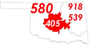 Los otros tres códigos de área de Oklahoma son el 539/918, que cubre el noreste del estado (incluida la ciudad de Tulsa) y el 580, que cubre el oeste y el sur.