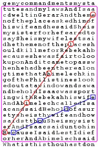 A menudo varias secuencias relacionadas con el mismo tema pueden aparecer simultáneamente en una serie de letras. Esto se debe a que se coloca el texto en una matriz regular, con el mismo número de letras en cada línea, extrayendo después un rectángulo. En el ejemplo, se muestra parte del Génesis (26, 5–10) con 21 letras por línea. Se muestran secuencias para BIBLIA Y CÓDIGO. Normalmente solo haría falta mostrar un rectángulo más pequeño, como el que aparece dibujado en la figura. En ese caso habría letras que faltarían, pero es esencial que el número de letras que falten sea el mismo para cada par de líneas adyacentes. Si no, no se cumpliría la secuencia.