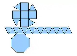 Desarrollo de la cúpula cuadrada giroelongada, con las caras coloreadas según su tipo de simetría.
