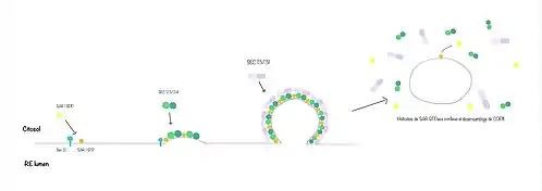 El primer paso para el ensamblaje de la cubierta COPII es la activación de la Ser GTPasa mediante su factor de intercambio de guanina Sec12.[7] En ese momento una hélice anfifílica N-terminal de la Sar1 se inserta en la membrana del RE e incorpora a los heterodímeros Sec23 y Sec24. Tras la incorporación de la carga y la formación de un complejo de pre-ensamblaje estable, se incorpora a los heterotetrámeros Sec13 y Sec31, capaces de adoptar forma de celda y de contener la vesícula y su carga.