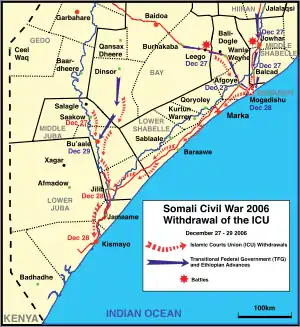 Se produjo después de una rápida cadena de victorias del Gobierno Transicional de Somalia y de las victorias militares de Etiopía contra la Unión de Cortes Islámicas (UCI), que tenía su sede allí antes de que huyera hacia el sur.