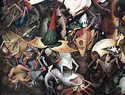 La composición, con una figura central situada entre muchas figuras menores, fue repetida por Brueghel varias veces alrededor de esos años, no sólo en otras pinturas como Dulle Griet sino también en una serie de grabados de los Vicios y las Virtudes que él había completado para el editor de Amberes Hieronymus Cock.[3] El conflicto entre el bien y el mal, el vicio y la virtud, es un tema recurrente en la obra de Brueghel:[4] en este cuadro, el Arcángel Miguel y sus ángeles son representados en el acto de expulsión de los ángeles rebeldes del Cielo; fue el Orgullo el pecado que causó la caída de Lucifer y sus compañeros.
