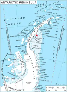 ![]() Mapa de la península Antártica con la península Ameghino en color rojo (mapa en inglés). | ||